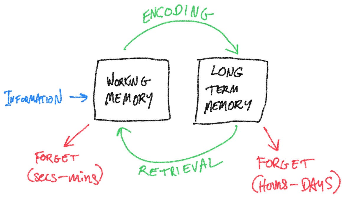 In simple terms, the brain possesses two kinds of memory: working memory, which temporarily holds information for immediate use, and long-term memory, where information is stored for extended periods. To preserve information for future use, it must be 'encoded' into long-term memory. Even in long-term memory, information can be forgotten, albeit generally over a more extended timeframe. When needed again, this stored information is 'retrieved' back into working memory for use.